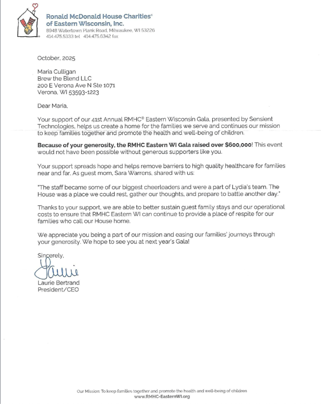 Brew the Blend™ proudly supported the 41st Annual RMHC Eastern Wisconsin Gala — “Pure Imagination” (September 27, 2025) by donating products for their silent auction. The event raised over $600,000 to help provide families with comfort, care, and a home away from home during their children’s medical treatments.