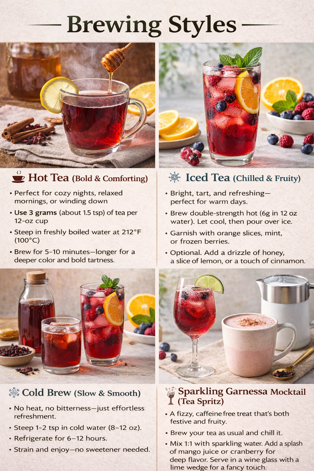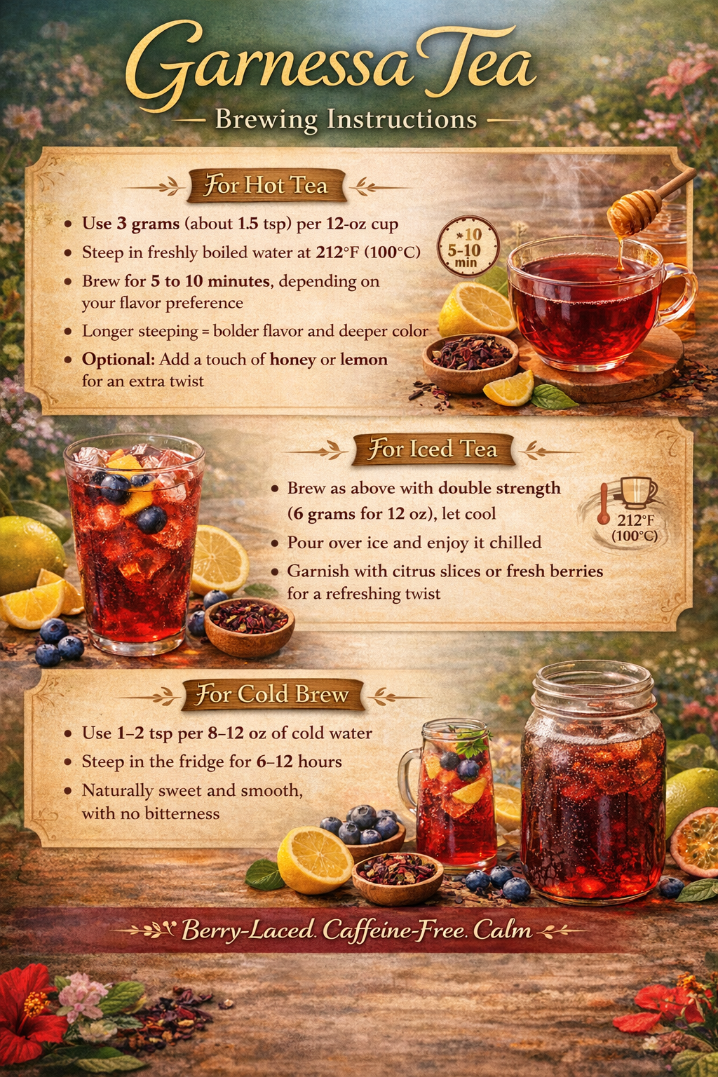 Explore Garnessa Tea your way—whether bold and soothing as a hot brew, chilled and fruity over ice, or smooth and refreshing as a cold brew. Steep it to match your mood and moment.