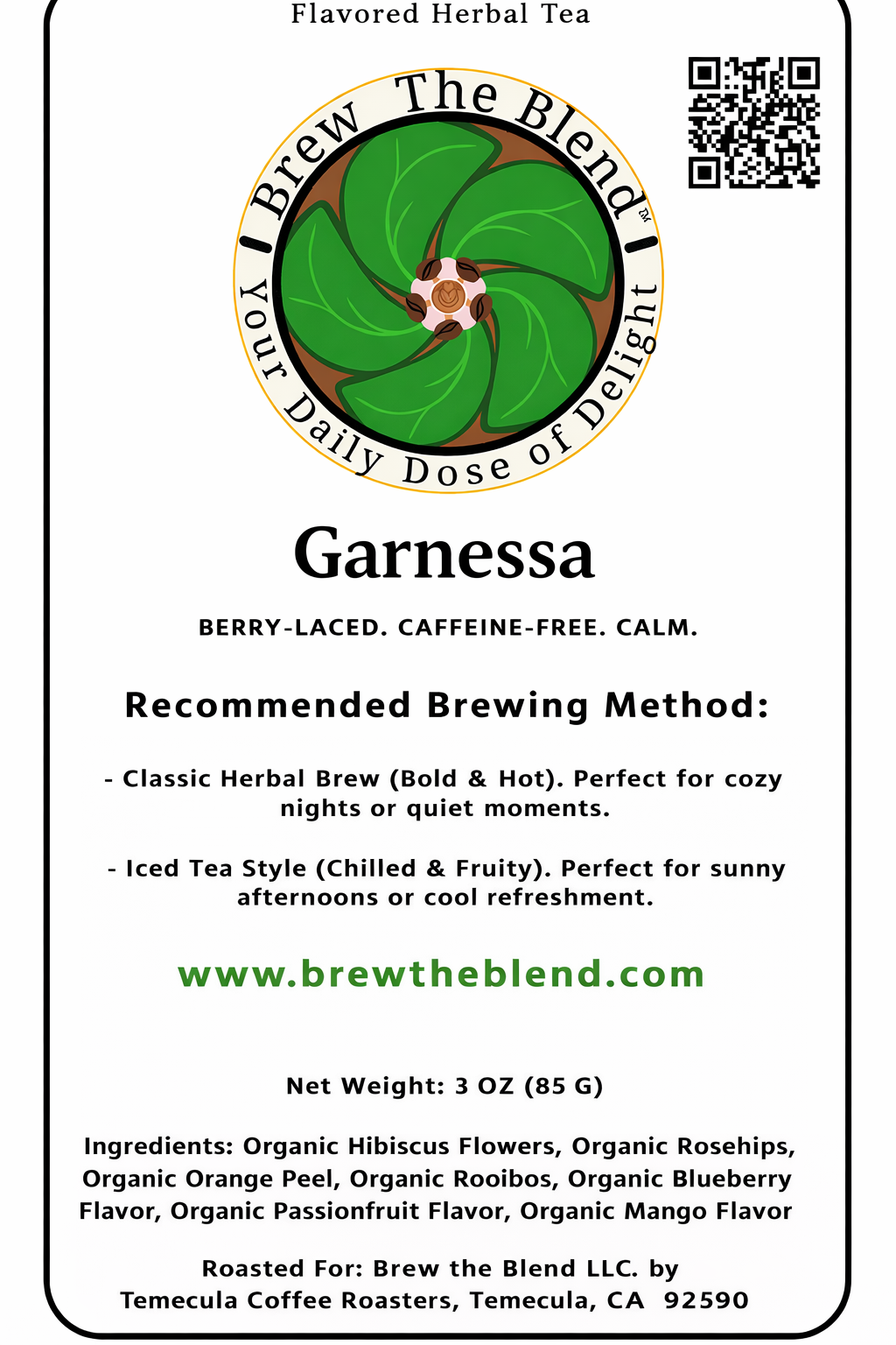 Garnessa Tea is a radiant, caffeine-free herbal blend that brings together the rich tartness of hibiscus, the gentle smoothness of rooibos, and the fruity elegance of blueberry, mango, and passionfruit. Its deep ruby hue hints at the vibrant flavor waiting in every sip—whether enjoyed hot, iced, or cold-brewed.