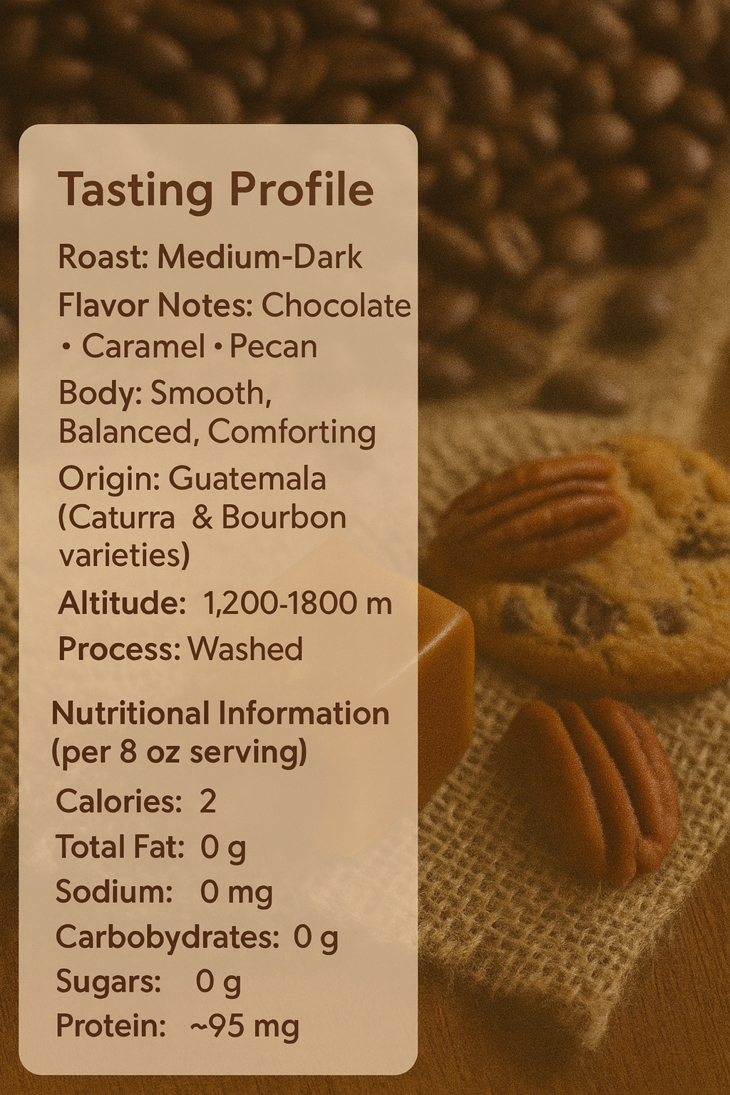 • 🍫 A dessert-inspired coffee with natural chocolate, caramel, and pecan notes.